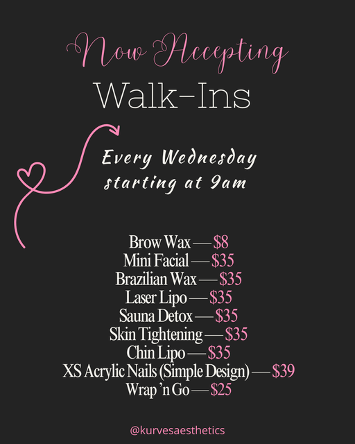 No appointment? No problem! Every Wednesday, we welcome walk-ins all day long with special deals you won't want to miss.